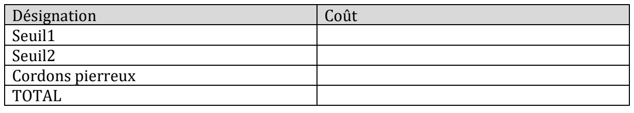 Les seuils sont conçus pour des crues d’occurrence décennale de 47 et 45 m3/S. De ce fait, ils peuvent faire transiter ces débits adaptés avec des charges d’eau de 0.5 à 0.4m.